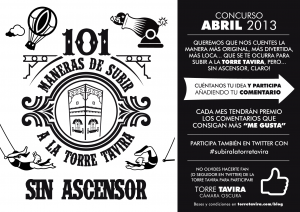 Ante esta situación, y como algunos entes públicos no lo ven necesario y nos deniegan el permiso, ponemos en marcha la campaña «101 Maneras de subir a la Torre Tavira«. El pistoletazo de salida de esta campaña es un Concurso para redes sociales en el que lanzaremos una propuesta de colaboración a la ciudadanía siendo ésta la que nos contará como subiría a una torre vigía de Cádiz que no tiene un ascensor, sin usar la escalera, naturalmente. El concurso se desarrollará a través de Facebook y Twitter y en las bases que os adjuntamos explicamos su dinámica y requisitos.