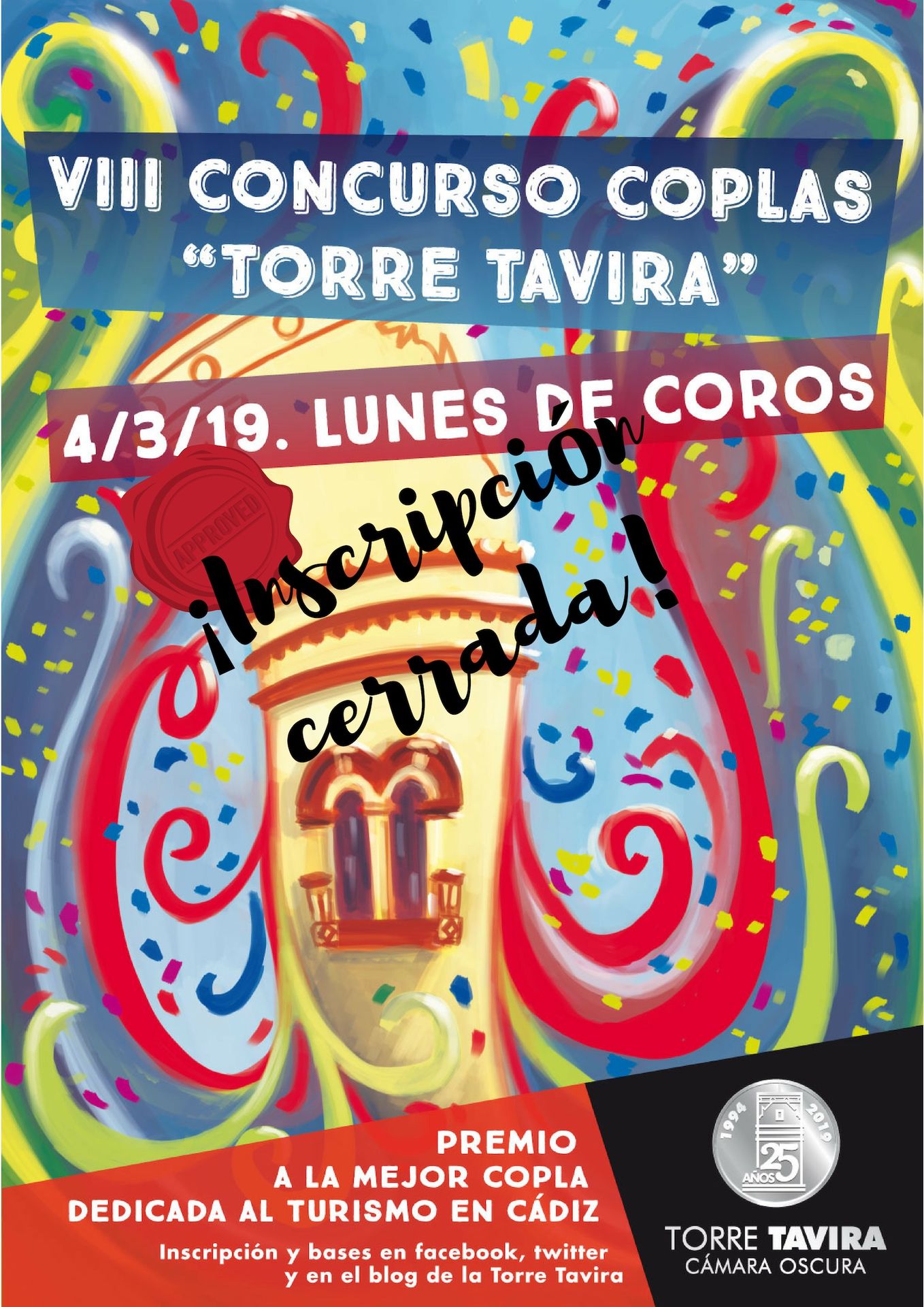 Desde TORRE TAVIRA, así como desde la organización del Concurso, sentimos mucho no poder atender las solicitudes que recibamos a partir de este momento. Nos gustaría dar las gracias a todas las agrupaciones que no puedan ser inscritas para esta edición por su interés en participar y esperamos poder disfrutar de sus repertorios en próximas ediciones. 😀