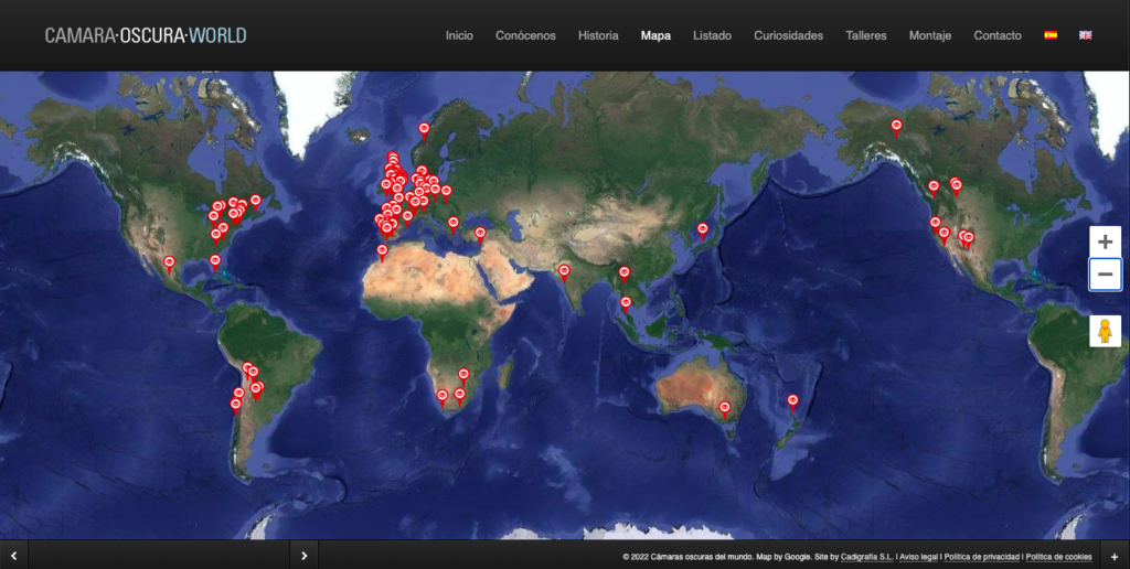 Si eres de l@s que tu primera experiencia en una Cámara Oscura despertó tu curiosidad y sientes unas increíbles ganas de saber más sobre este maravilloso efecto óptico, su funcionamiento, su historia, y dónde poder disfrutar de otras Cámaras Oscuras no puedes dejar de pasarte por camaraoscuraworld.com. ¡Un portal web en el que recogemos más de 100 Cámaras Oscuras en todo el Mundo! Podrás conocerlas todas ellas, sus historias, curiosidades, fotografías y ubicarlas en un mapa interactivo.