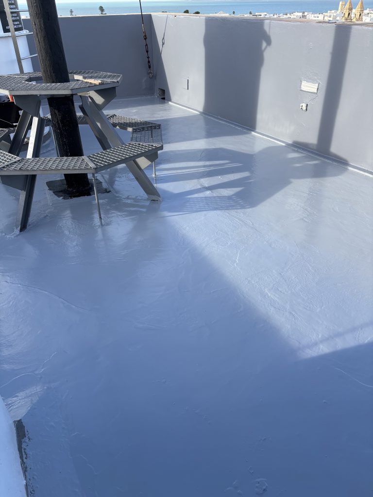 Uno de los trabajos más delicados ha tenido lugar en la terraza, donde ha sido aplicado un tratamiento especial con poliurea para evitar las filtraciones de agua desde la terraza hacias las estancias situadas justo bajo el mirador. La Poliurea es un material impermeabilizante que se utiliza a menudo en entornos industriales y comerciales para proteger las superficies de los daños causados por el agua. Se aplica como revestimiento líquido, que cura rápidamente formando una barrera impermeable y duradera.