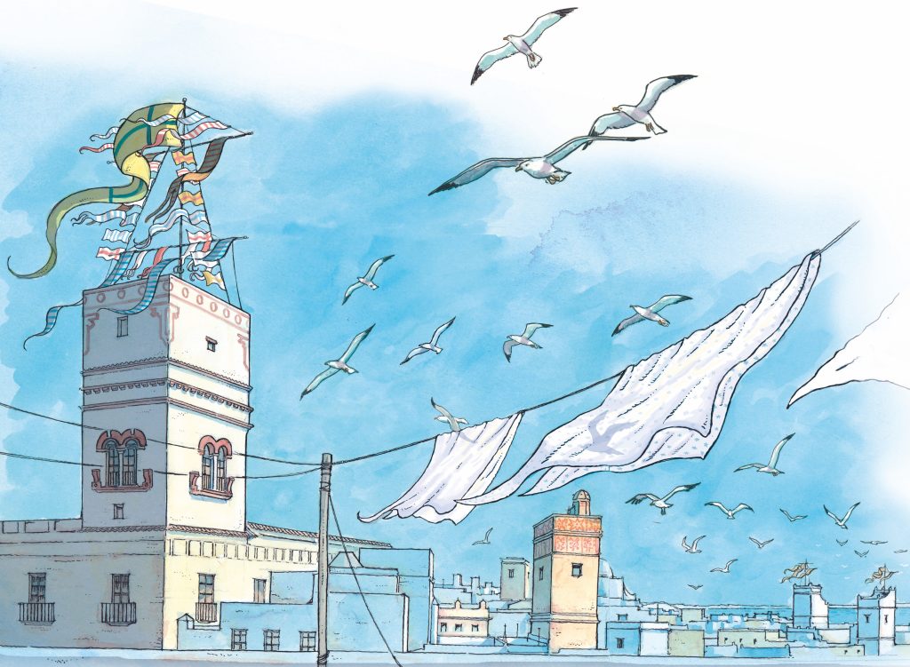 Recreación de la Torre decorada con banderas y gallardetes en el S. XVIII. Ilustración: Arturo Redondo