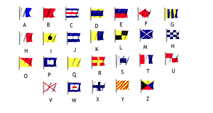 • Las banderas cuadradas o rectangulares suelen ser banderas alfabéticas, es decir, son las que se asocian a una letra y se nombran utilizando la nomenclatura del alfabeto internacional de radio.