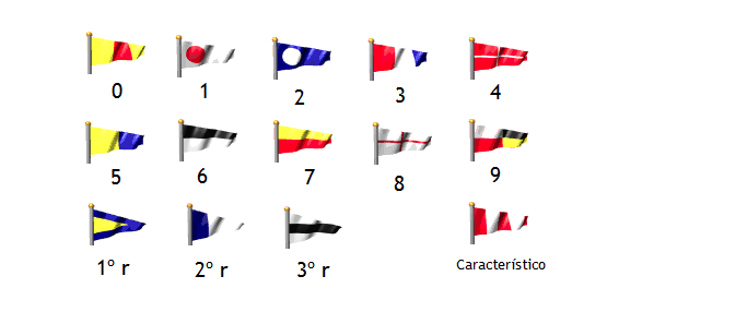 • Por su parte los gallardetes o banderas triangulares, son banderas numéricas, es decir, cada una de ellas representa un número. Para los casos en los que se disponga de un solo gallardete para cada número y sea necesario repertir alguno, se recurre a la figura de los «repetidores». La lectura de estas banderas se realiza desde la bandera superior a la inferior, no horizontalmente.