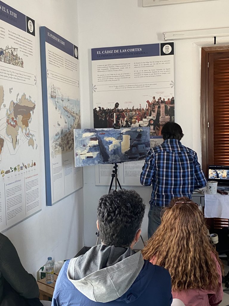 Cecilio nos deleitó con una magistral master class en la que, partiendo de un lienzo en blanco, nos mostró el proceso de creación de un cuadro. Fue realmente especial ver y vivir una introducción a su trabajo, pudimos conocer el planteamiento de un cuadro desde el principio. Con el lienzo en blanco, Cecilio fue compartiendo los pasos y procesos necesarios para llegar a la concepción final de la obra.